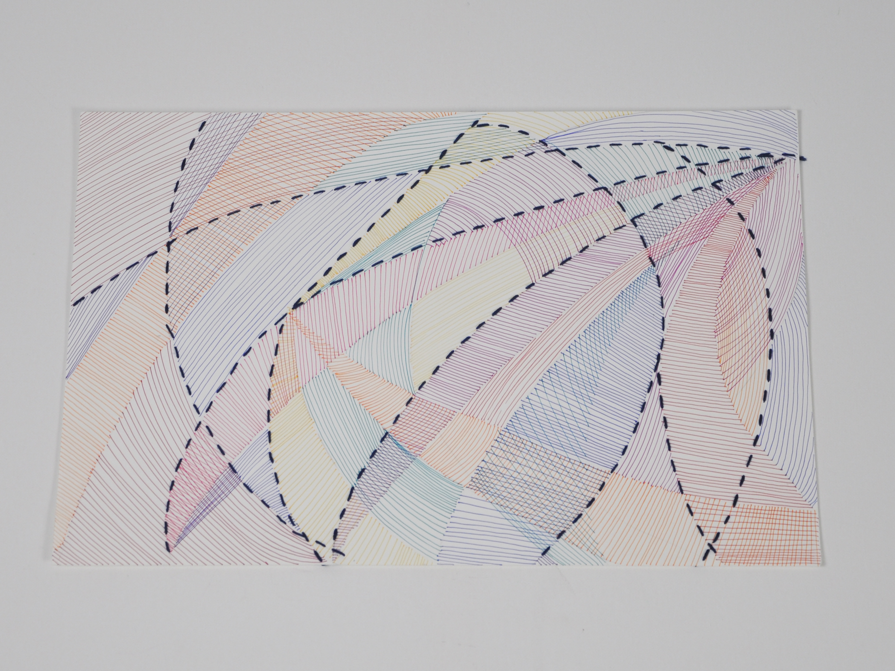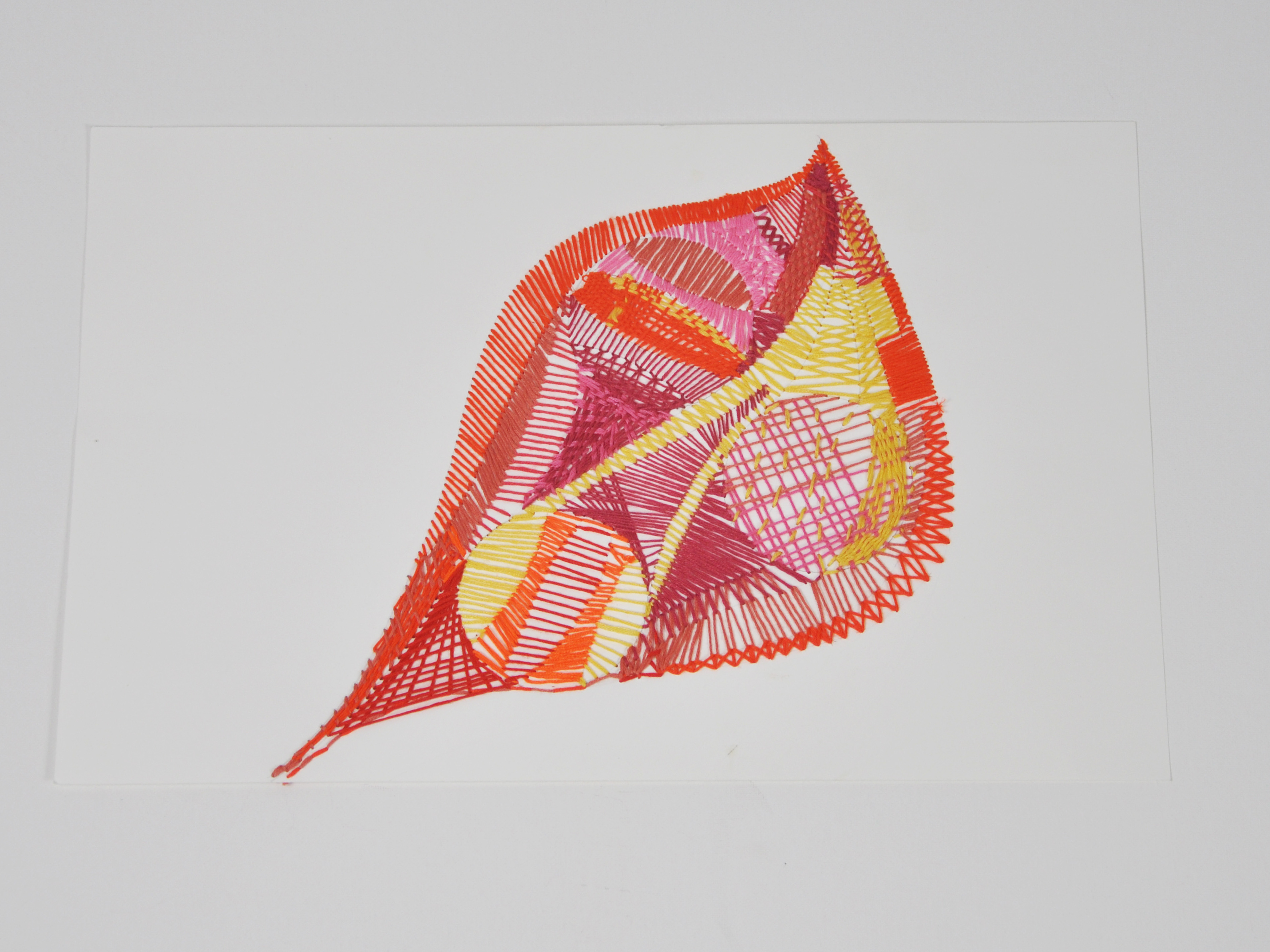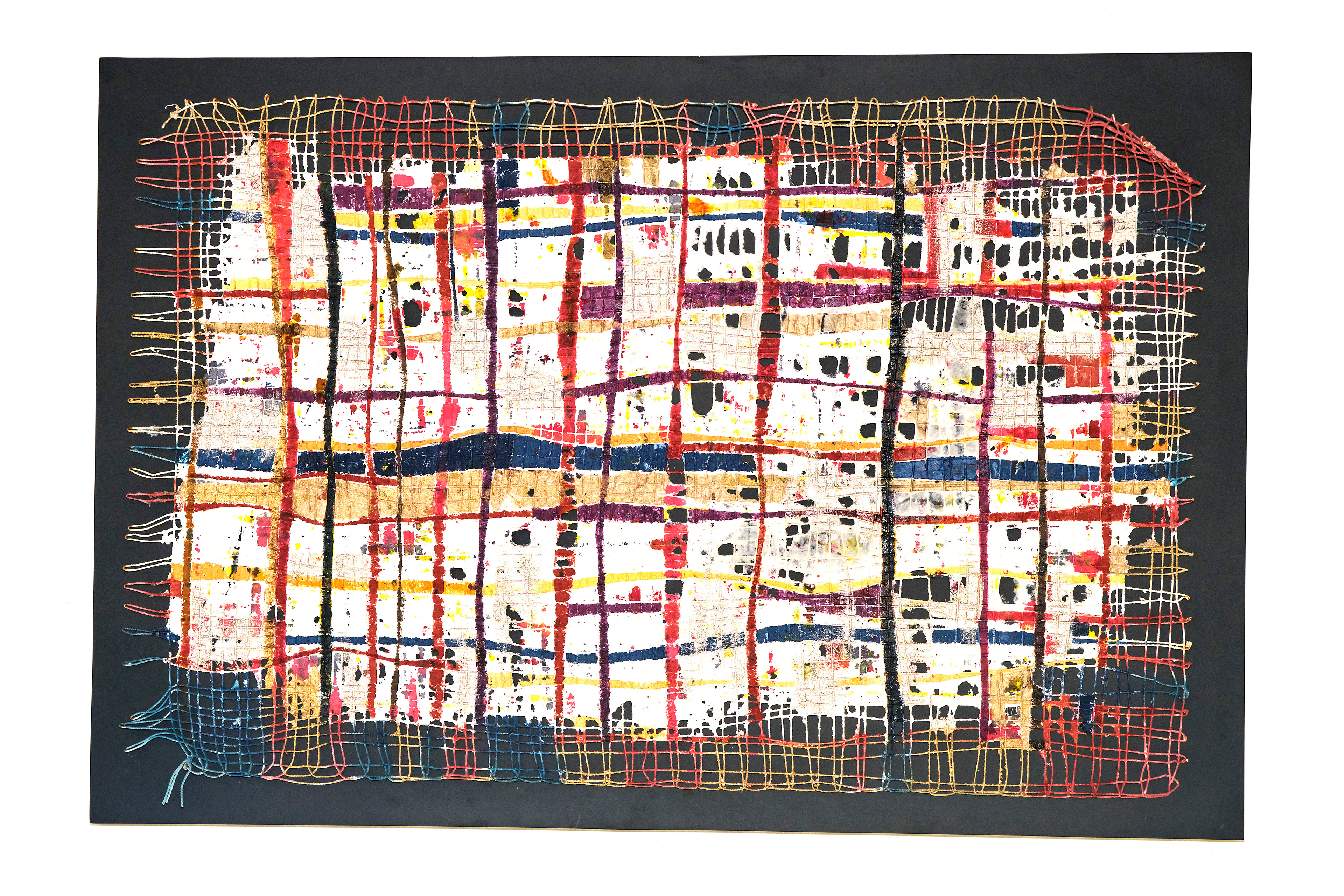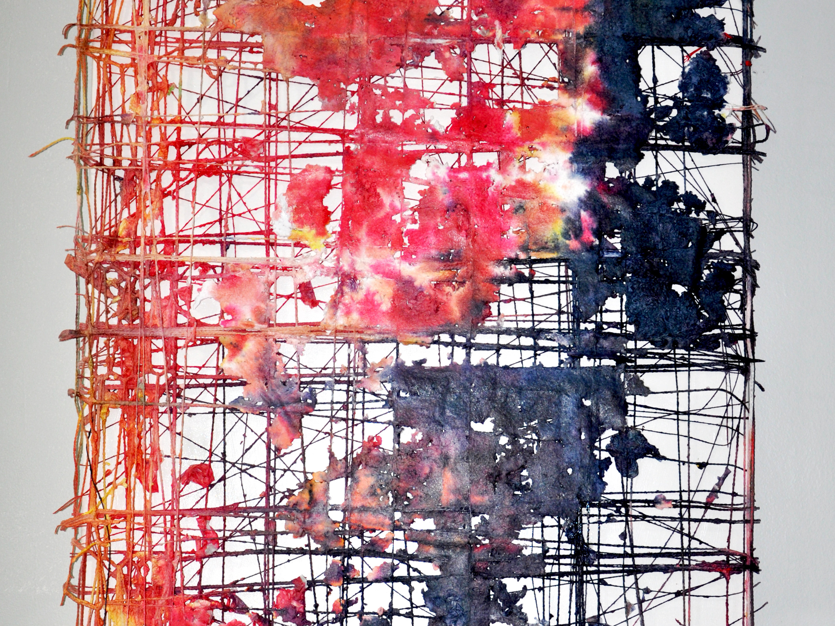 Acrylic inks are painted along selected routes, staining the threads in rhythms of red, gold, blue, and white. The color travels through the structure like currents of energy or traffic in a city, revealing zones of density and openness, order and improvisation. The piece reads as a vital map of experience—where every intersection is a decision, every deviation a story—and asserts the grid not as a rigid system, but as a flexible, human, and deeply emotional space.
