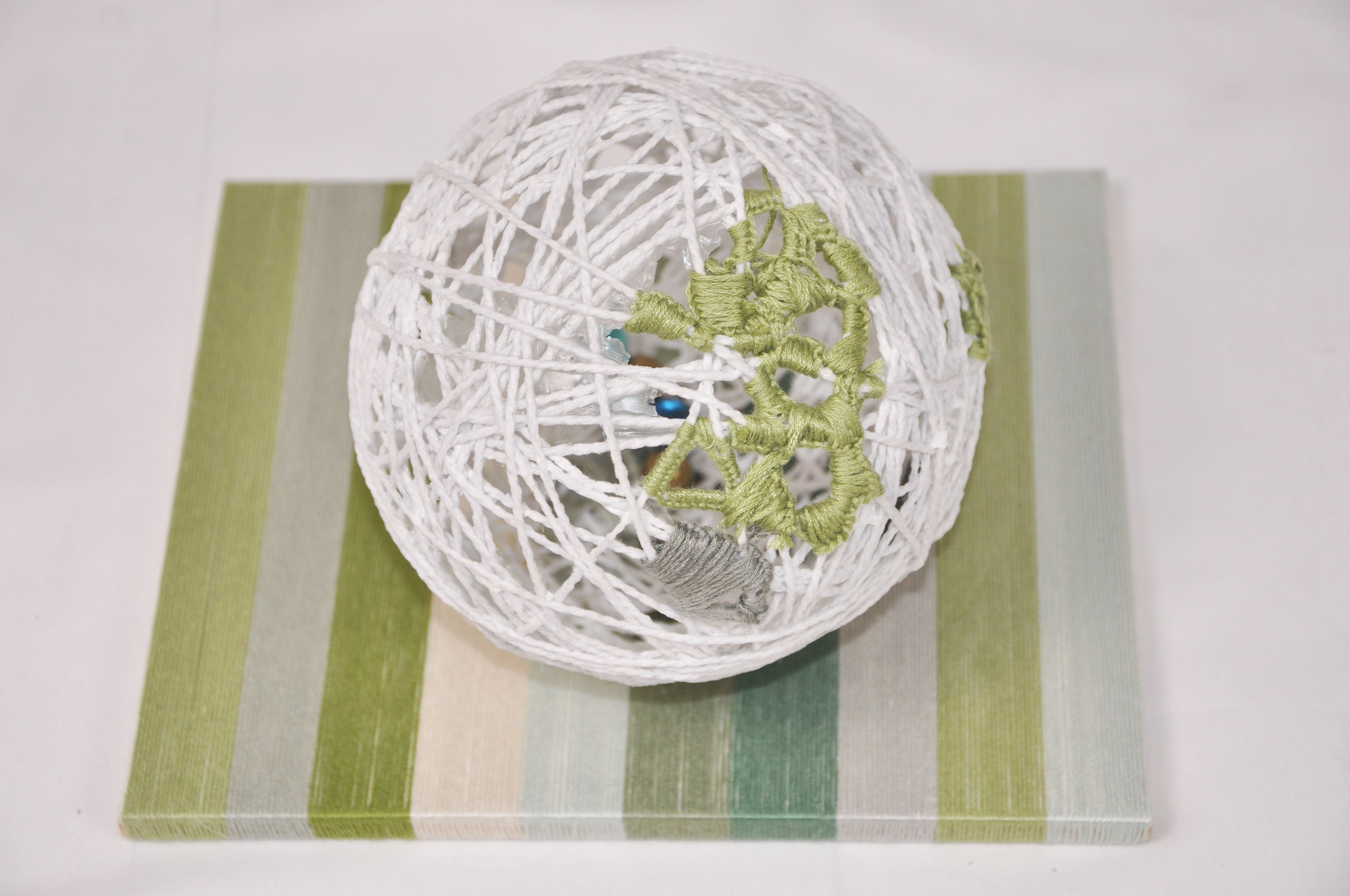 Breathing Sphere brings together earth and air: a grounded base wrapped in gradients of green holds a delicate cotton sphere that feels as if it were floating. The open threads create a porous architecture where light, shadows, and tiny embroidered constellations move gently across the surface, suggesting pockets of memory or seeds of new beginnings. The work speaks of balance—between structure and openness, stillness and growth—inviting the viewer to imagine the inner world that quietly expands inside this woven universe.