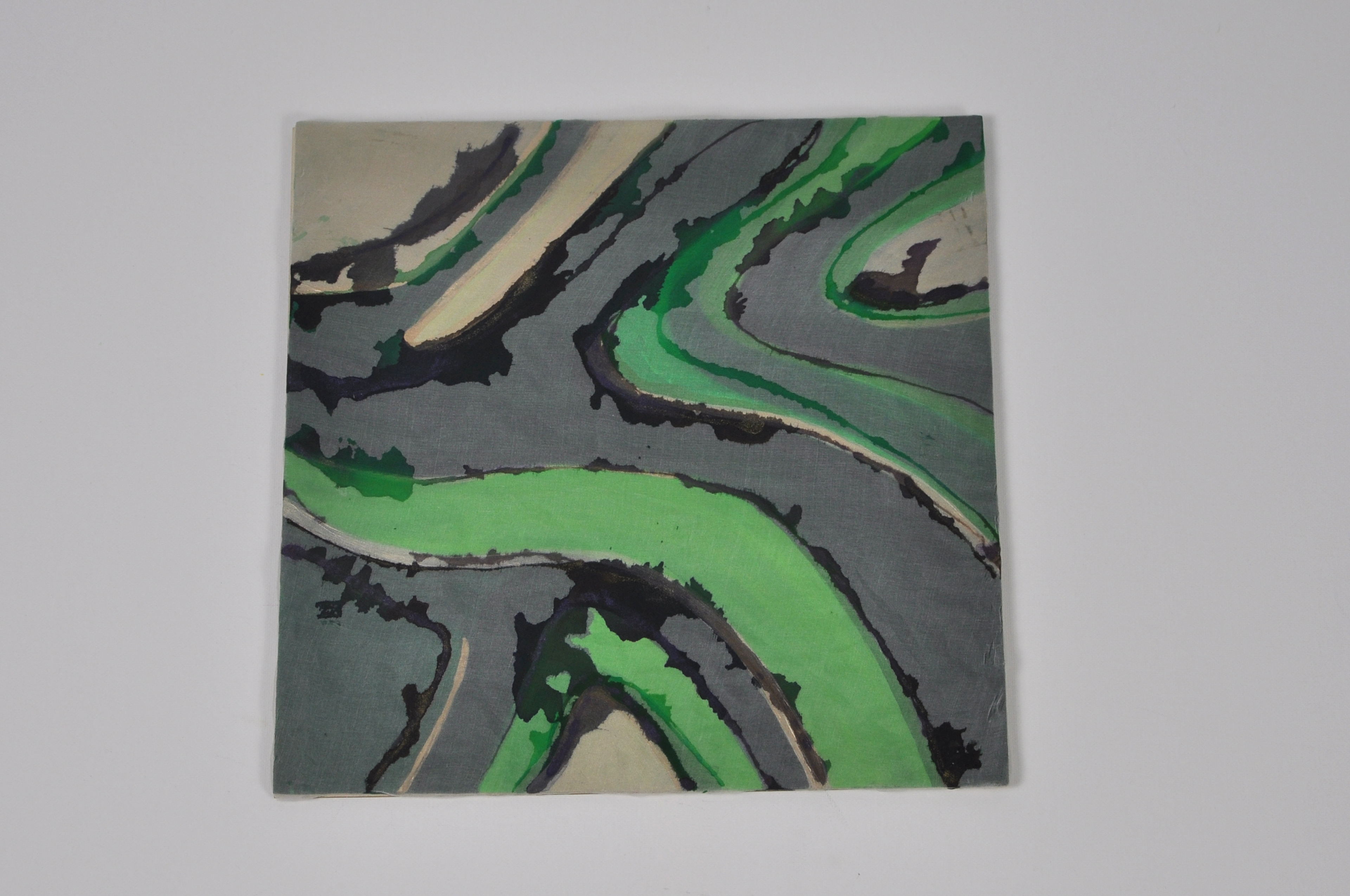 Emerald Currents is built on a painted wood base where bands of green, gray, and violet flow like contour lines of an inner landscape. A translucent organza layer sits on top, catching light and softly reflecting the painted forms beneath, which are further intensified with selective dyes.