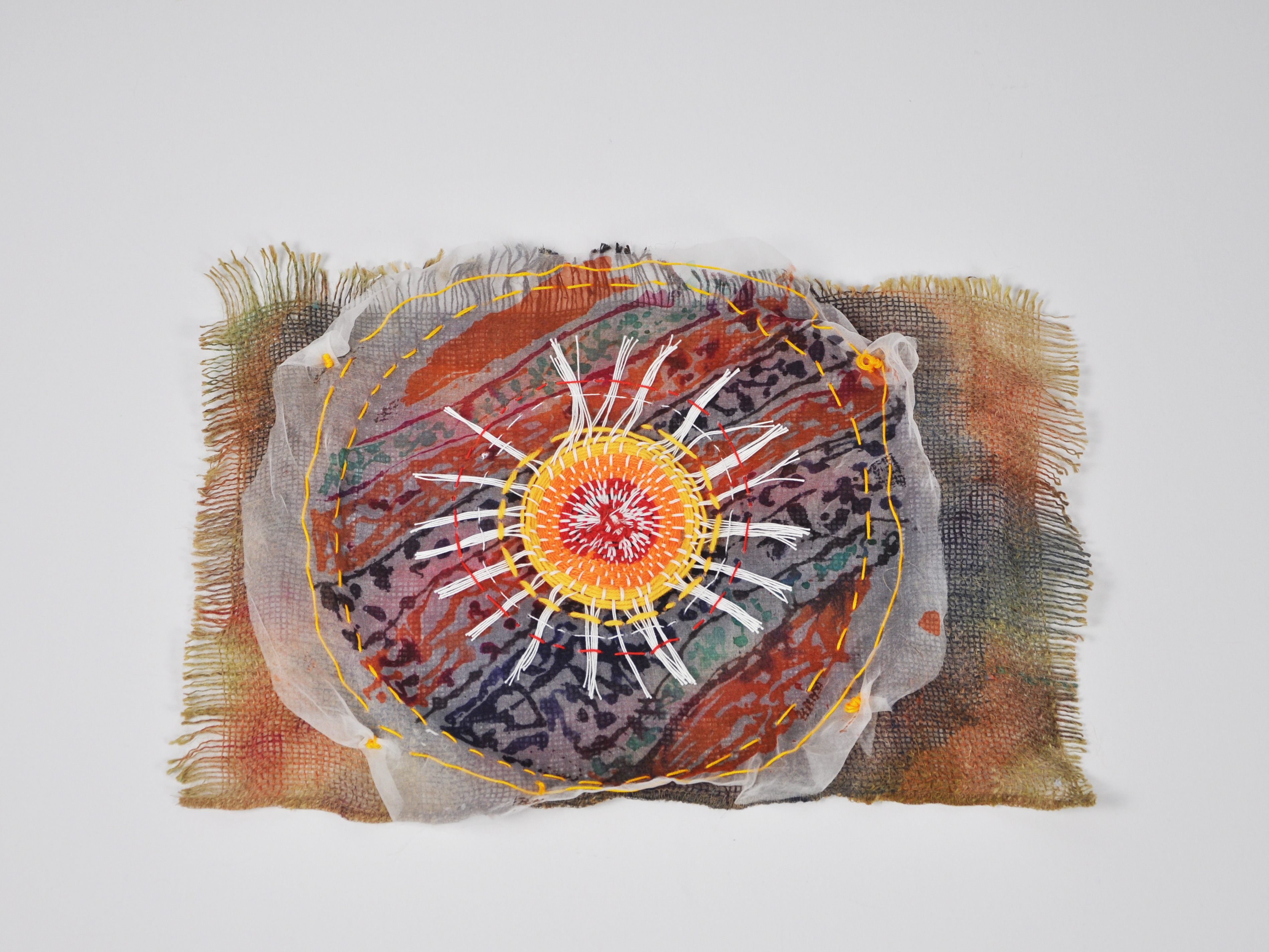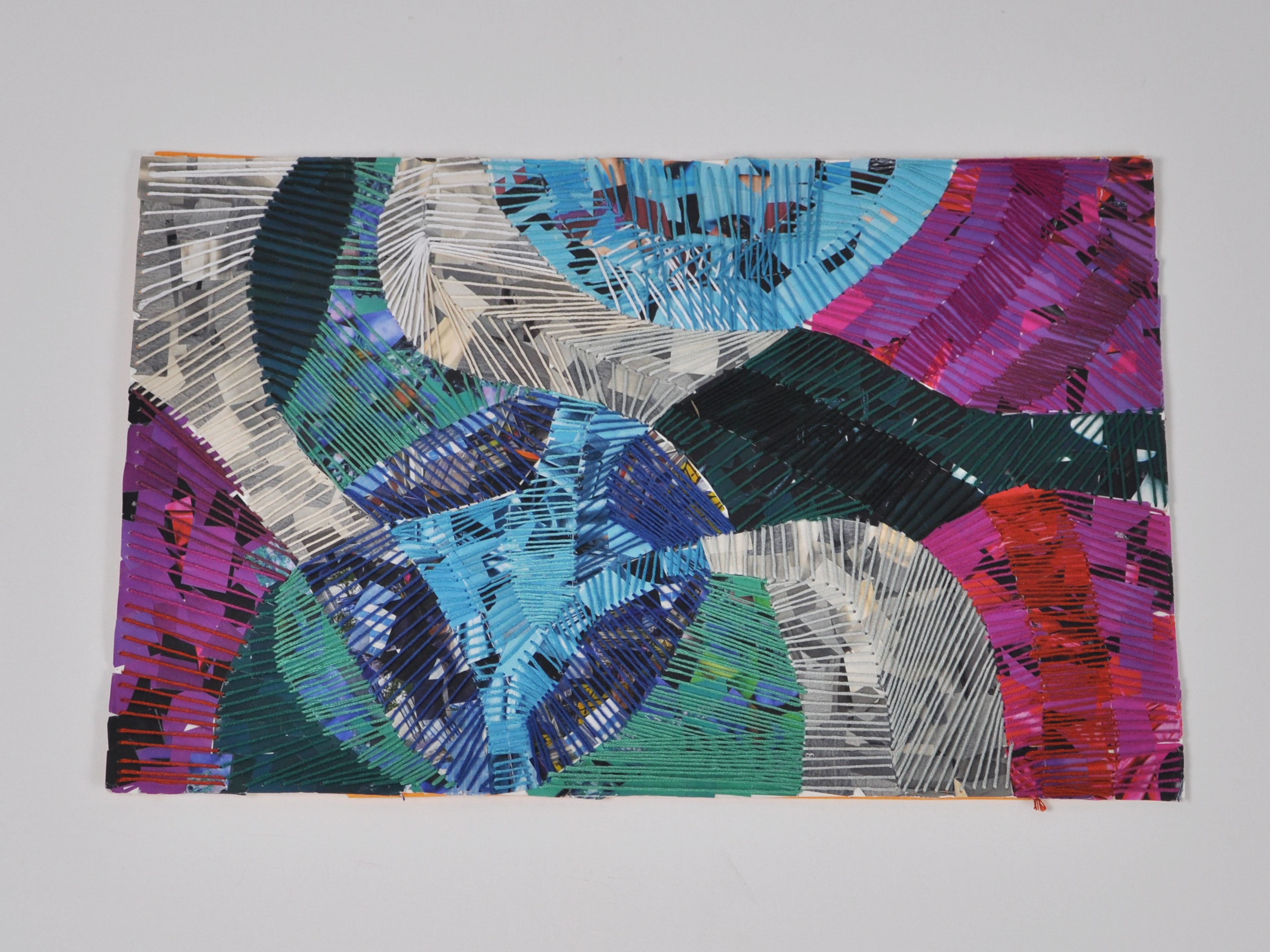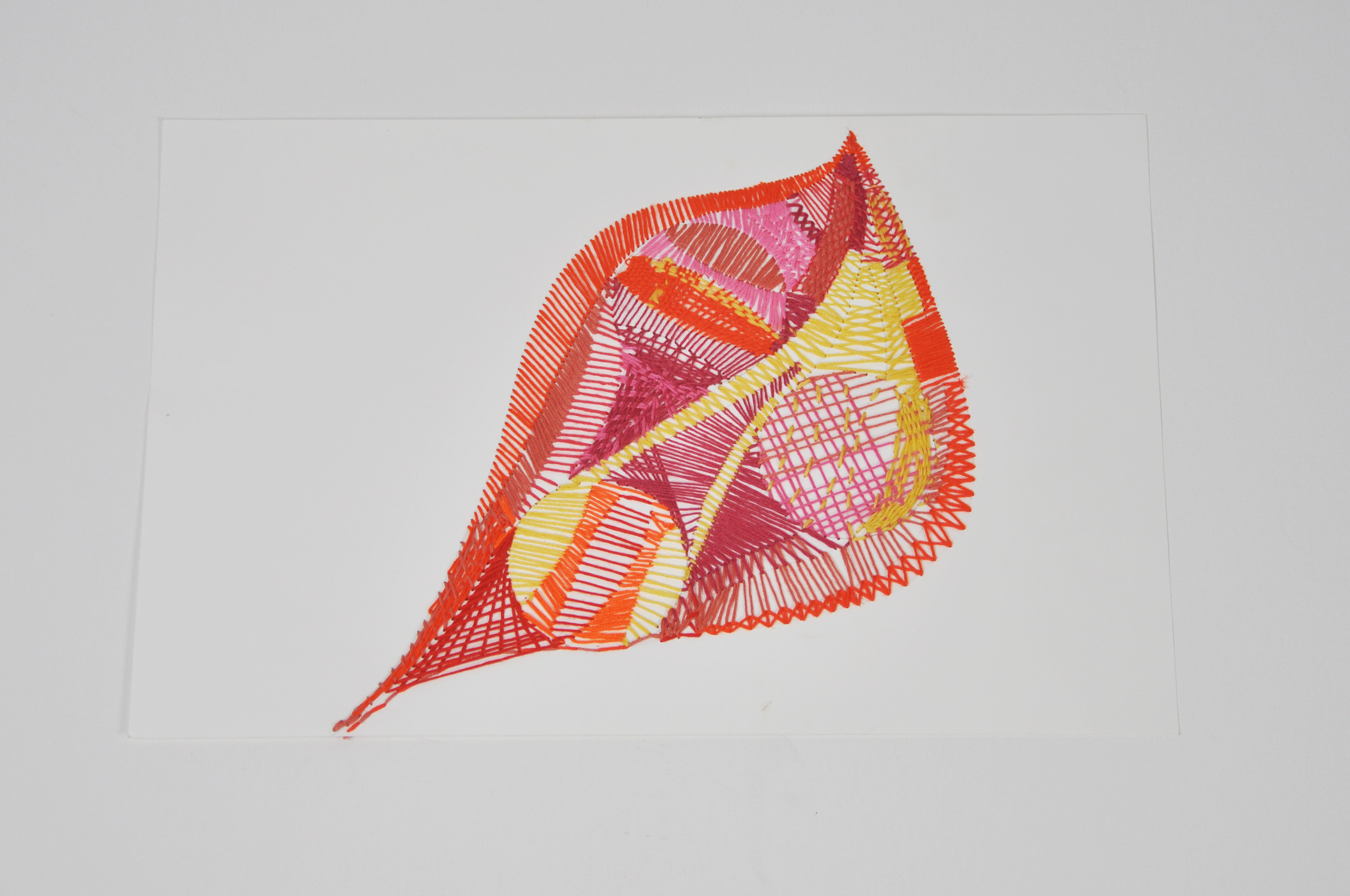 Fragmented Leaf uses the same pierced-paper technique as Pulsing Lines, but the stitching unfolds into a more intricate choreography of curves and crossings. Fine cotton threads in vivid reds, pinks, and yellows stretch across the punched surface, weaving tight geometric arcs that accumulate into a single, leaf‑like form.