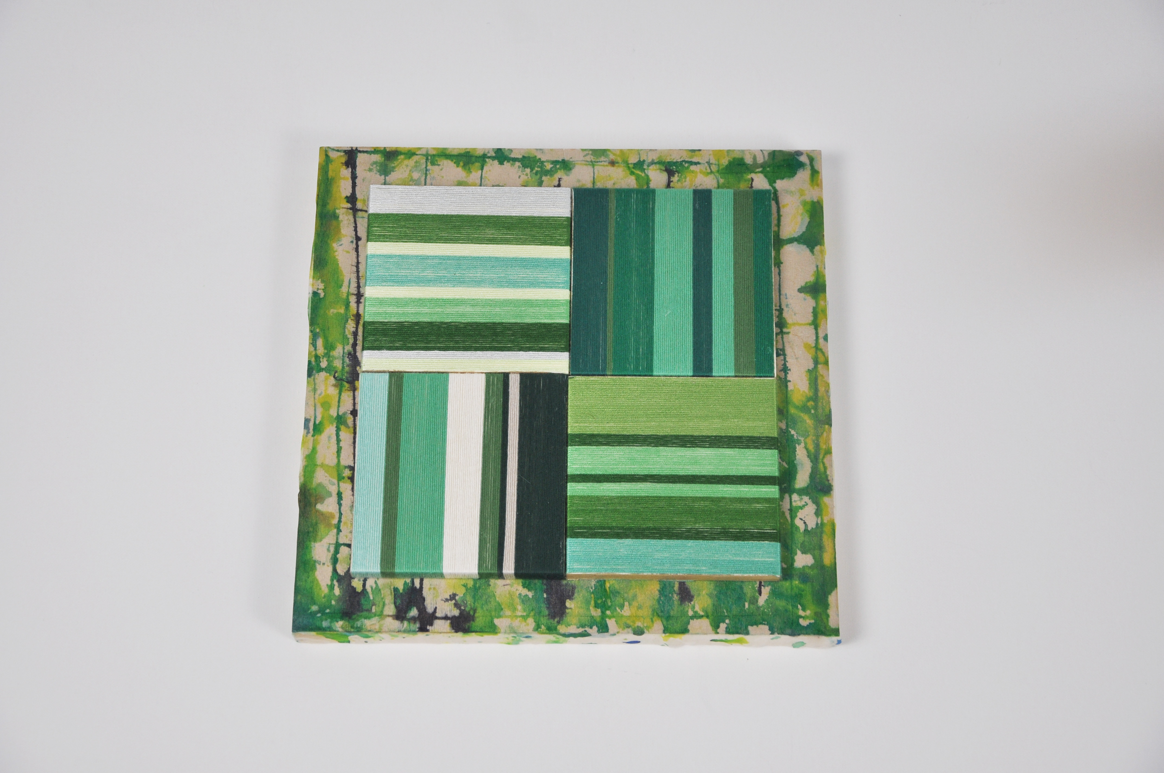 Green Fields is composed on a painted base where splashes of yellow‑green and dark lines evoke a loose, organic ground. On top of this surface, four square blocks are carefully arranged, each one tightly wrapped with cotton string in different alignments and shades of green.