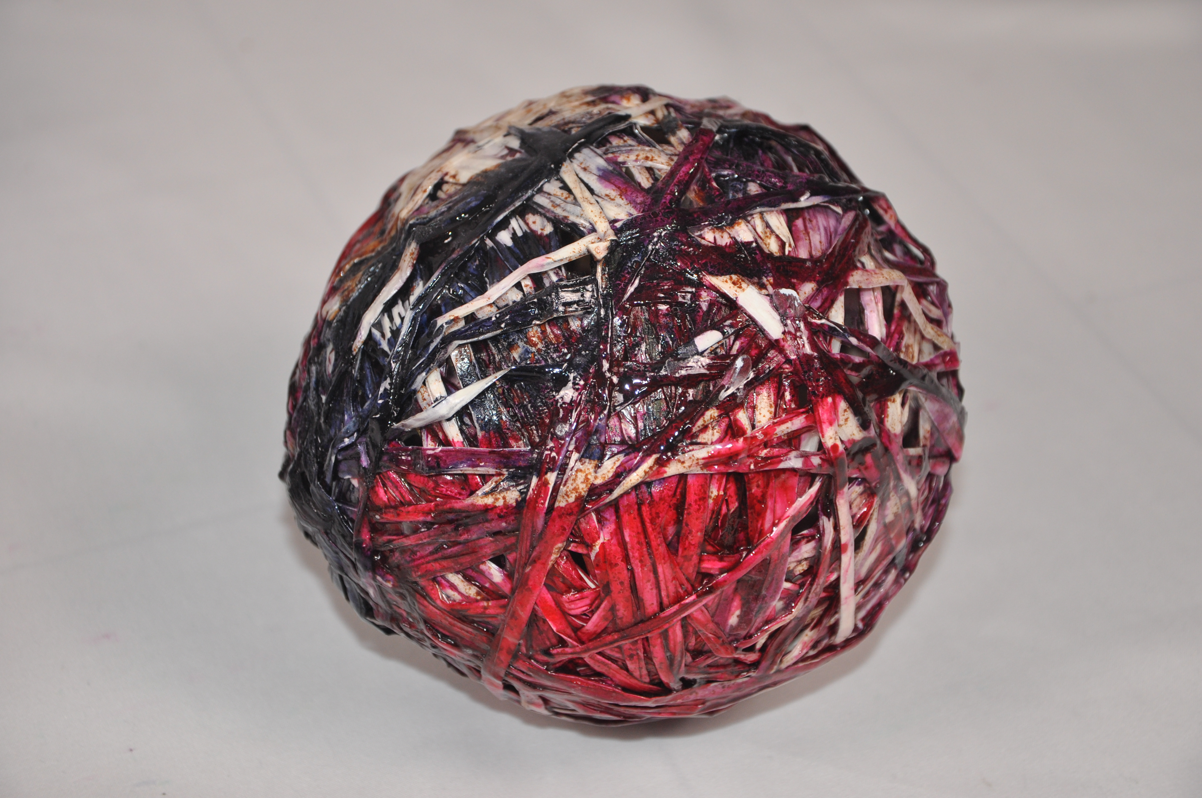 Heartcore is a dense, woven sphere that holds the accumulated weight of lived experience. Layers of hand-dyed paper—stained in deep reds, violets, and charcoal—wrap around an invisible center, each strip a trace of emotion absorbed over time. The surface reveals both chaos and intention: fibers cross, overlap, and sometimes tear, mirroring the way memories tangle inside us.