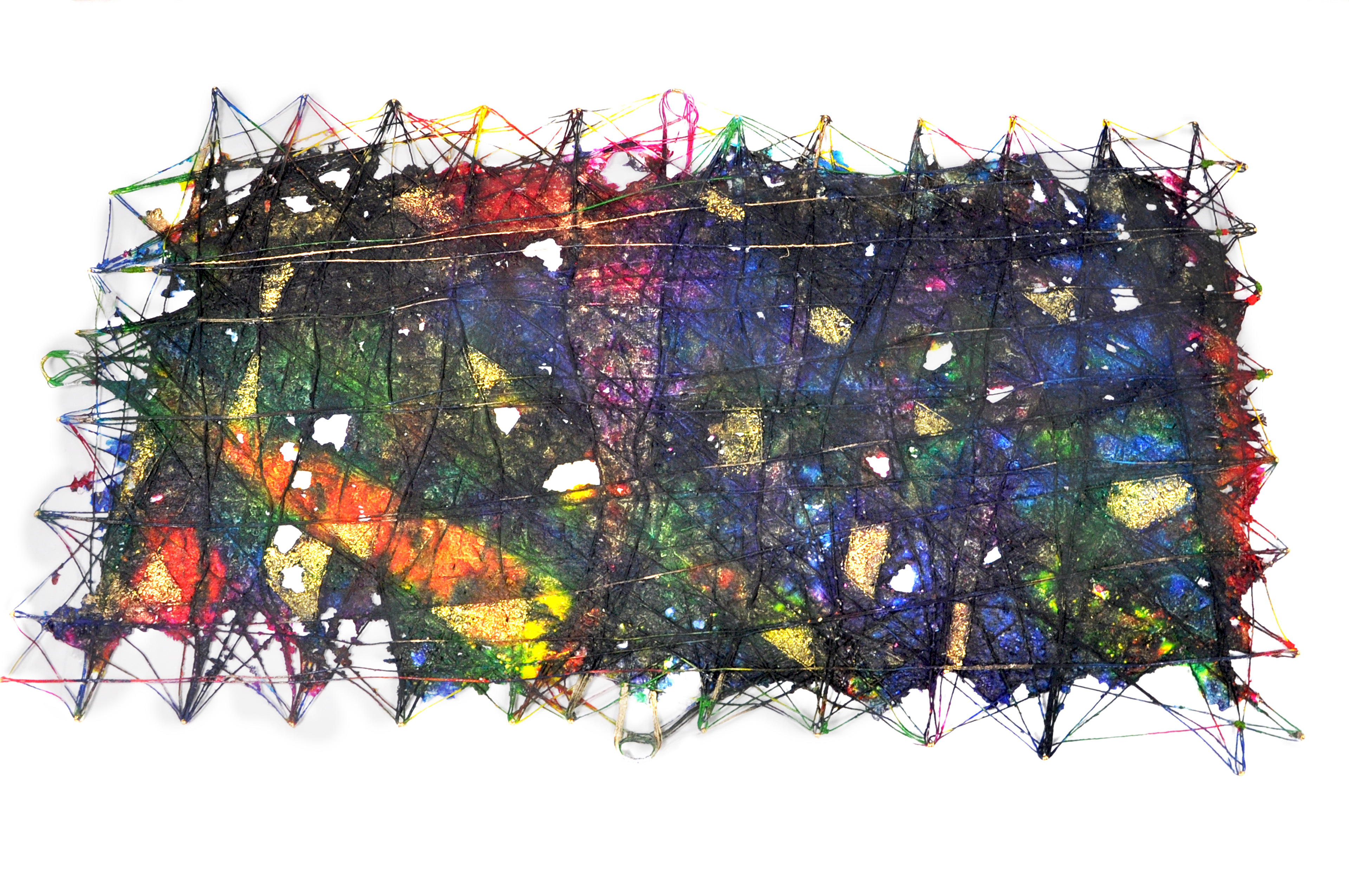 Night Grid is built from intersecting wool strings that travel in multiple directions, carving shifting edges and invisible borders across space. Over this woven skeleton, a second skin of white paper pulp absorbs layers of dye, creating a deep, luminous field where color moves like distant constellations. Glimmers of gold leaf mark certain zones as if they were treasured memories or points of passage, suggesting that even within structures and limits, there are portals of possibility and light.