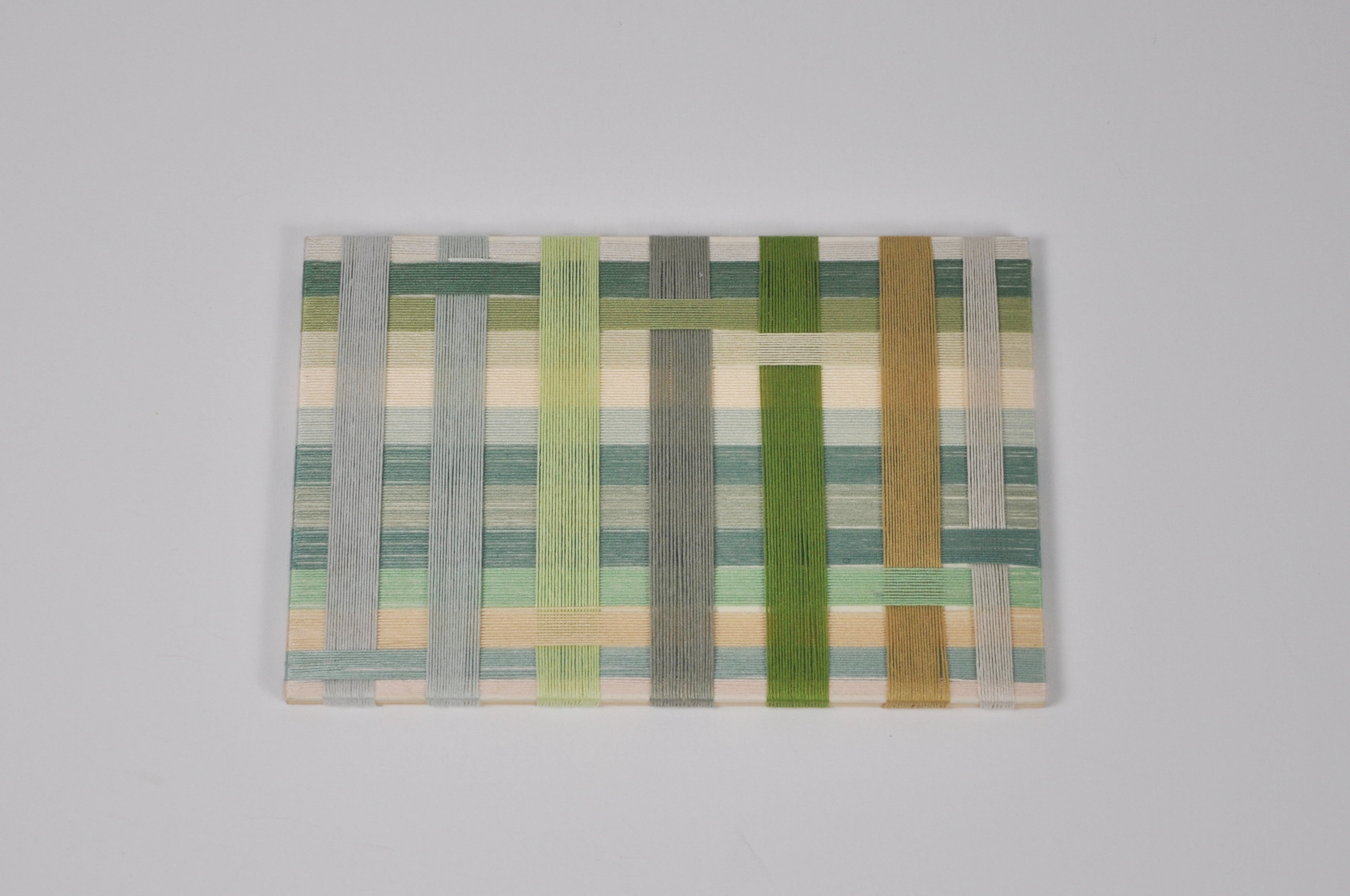 Woven Greens is composed of parallel bands of thread in soft and vivid green tones, wrapped tightly around a rectangular base. Vertical and horizontal strands interlace to form a subtle grid, where each hue shifts slightly in value and temperature, creating a calm yet dynamic rhythm.